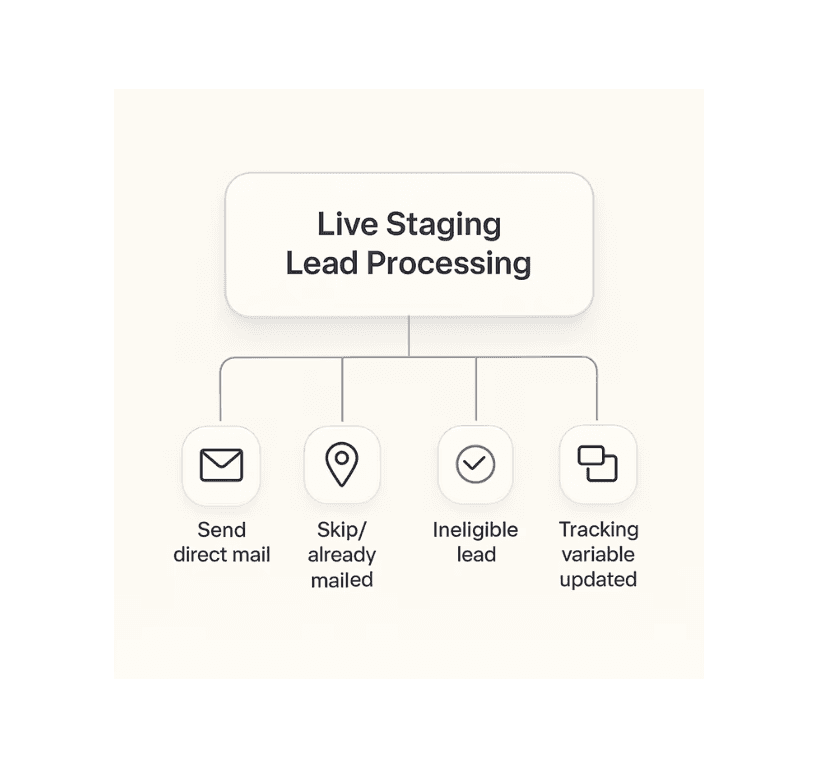 This workflow processes Live Staging Leads by validating their location details, checking whether direct mail has already been sent, and automatically sending direct mail only to eligible leads while updating the tracking variable to prevent duplicate mailings in future runs.