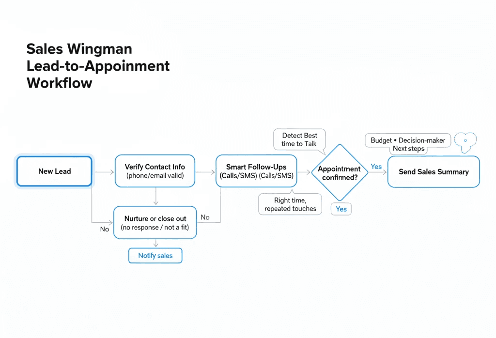 This workflow converts new leads into appointments by validating phone numbers, extracting appointment times, and placing smartly timed, repeated calls. It tracks call attempts, updates counts, confirms or fails appointments, and emails sales reps structured summaries, budgets, decision‑makers, and clear next steps.