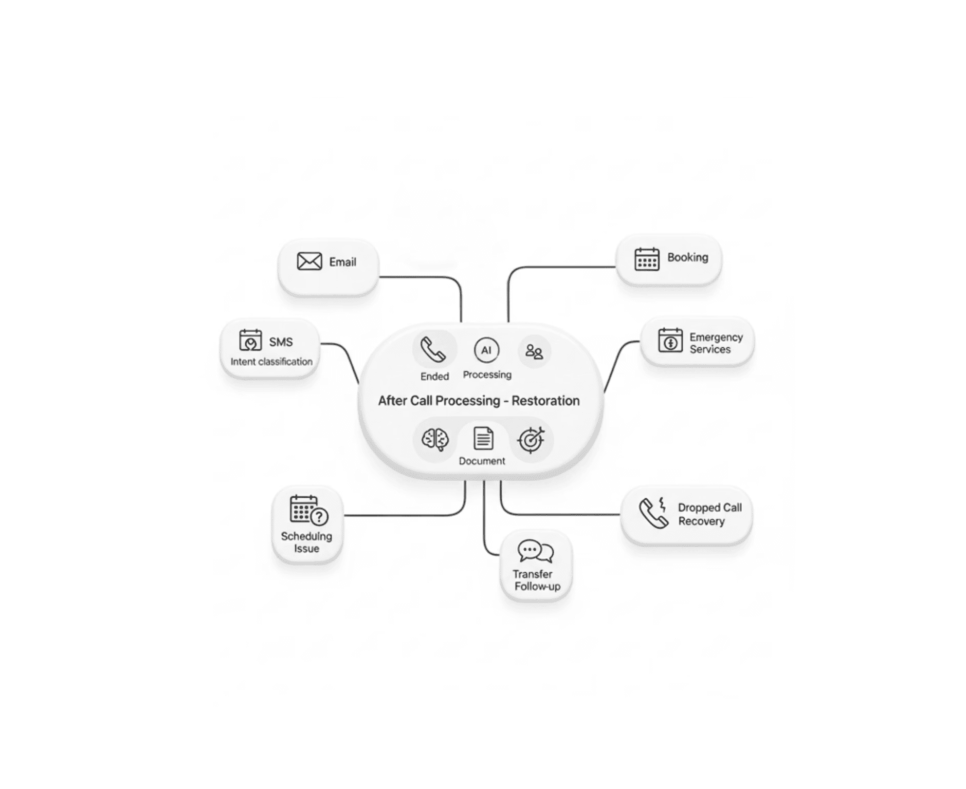After Call Processing – Restoration analyzes an inbound call after it ends, generates a call summary, classifies the caller’s intent, and routes the outcome to send targeted email and SMS alerts to the appropriate team members for bookings, emergencies, scheduling issues, transfers, or dropped calls.