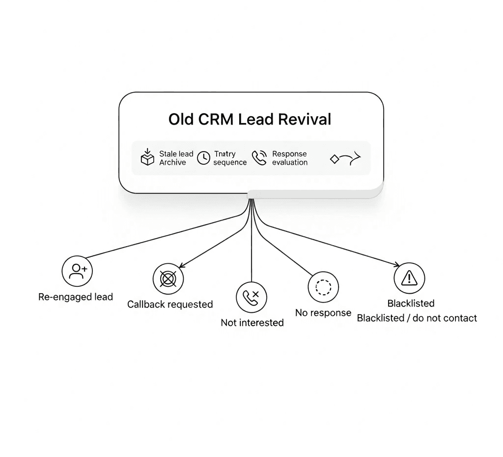 This workflow revives old CRM leads by intelligently calling stale contacts over a seven day window, limiting attempts, respecting time rules, and adapting to answers, voicemails, blacklists, and outcomes so each lead is clearly tagged with its final revival status in CRM OK.